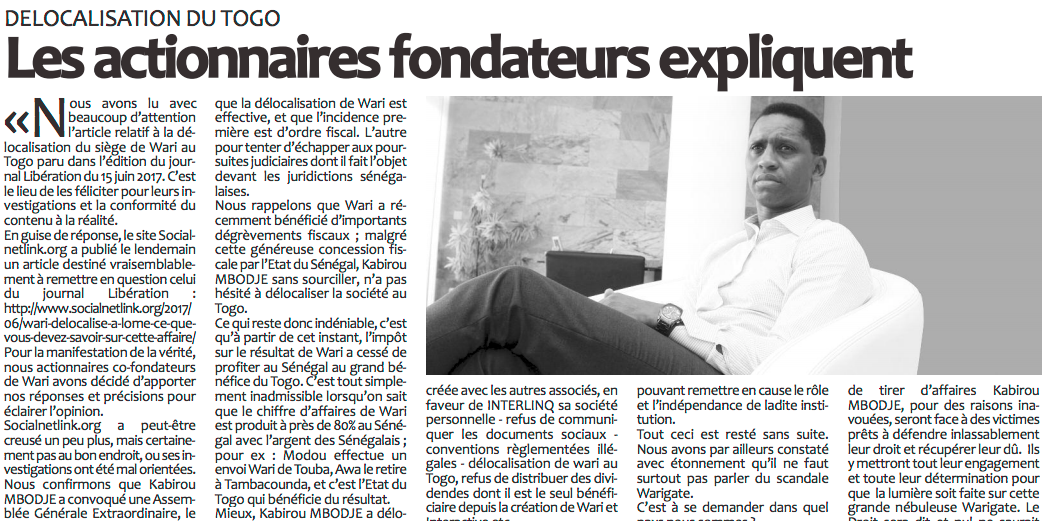 Suite à la publication d’un article intitulé Wari “délocalisé” à Lomé : Ce que vous devez savoir sur cette affaire ! des fraudeurs et Cofondateurs de Wari ont publié une contribution dans le journal Libération accusant notre plateforme de favoritisme comme le témoigne cette capture.