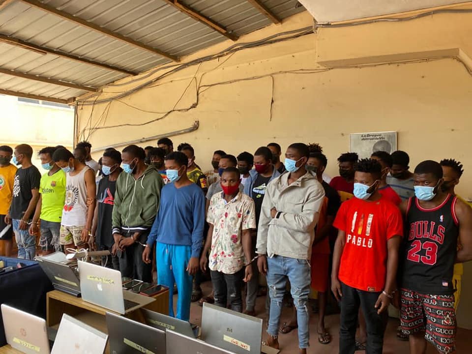 Sur sa page Facebook, la police togolaise affiche fièrement son dernier coup de filet. Une quarantaine de jeunes hommes, le visage caché derrière un masque, posent devant les armes du crime: des ordinateurs portables et des smartphones.