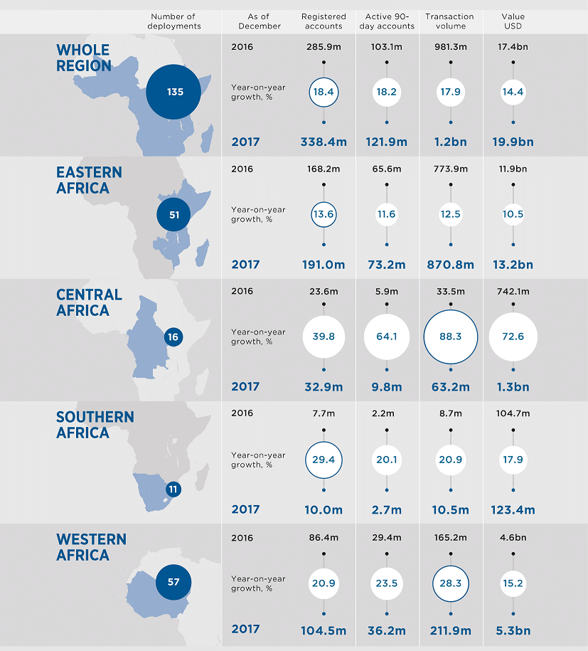 L’organisation mondiale de l’écosystème du mobile précise également qu’en 2012, le mobile money était en grande partie un phénomène est-africain, l’Afrique subsaharienne représentant 84% de l’ensemble des comptes actifs sur 30 jours.