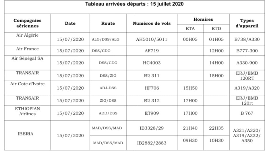 Selon senego, les vols au départ de Dakar débutent également le même jour pour plusieurs compagnies aériennes.