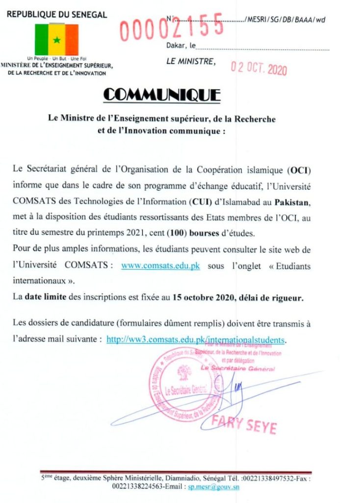 Le Secrétaire général de l’Organisation de la Coopération islamique (OCI) informe que dans le cadre de son programme d’échange éducatif, l’Université COMSTS des Technologies de l’Information (CUI) d’Islamabad au Pakistan met à la disposition des étudiants ressortissant des Etats membres de l’OCI , au titre du semestre du printemps 2021, 100 bourses d’études.