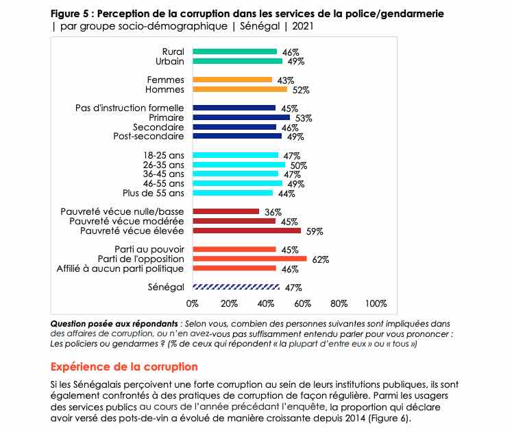 La police et la gendarmerie sont les deux corps les plus corrompus selon le document. « La hausse de la corruption est plus perçue chez les policiers et gendarmes : Presque la moitié (47%) des citoyens estiment que « la plupart d’entre eux » ou « tous » sont corrompus – une augmentation de 18 points de pourcentage depuis 2017« , détaille le rapport qui précise que cette note est suivie par les députés et les conseillers municipaux ou départementaux (+13 points de pourcentage), les juges et magistrats (+12 points), les officiels de la présidence (+11 points) et les fonctionnaires (+7 points).