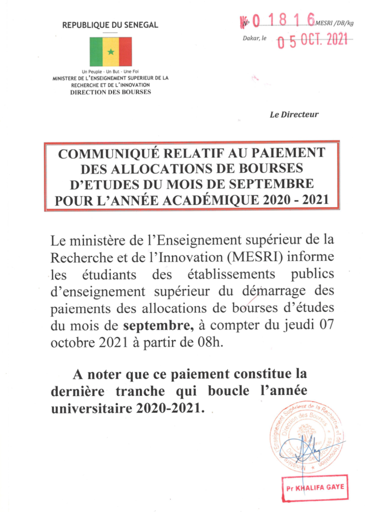 Le Ministère de l’Enseignement supérieur, de la Recherche et de l’Innovation (MESRI) informe les étudiants des établissements publics d’enseignement supérieur du démarrage des paiements des allocations de bourses d’études du mois de septembre, à compter du jeudi 7 octobre 2021 à partir de 8H.