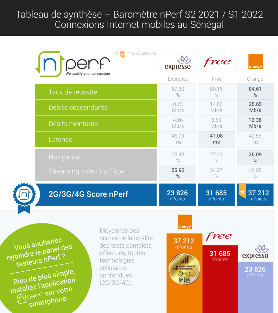 Le baromètre des connexions Internet mobiles au Sénégal de nPerf Speed Test révèle que le leader Orange a fourni les meilleures performances globales de l’Internet mobile sénégalais au cours des deux derniers semestres.