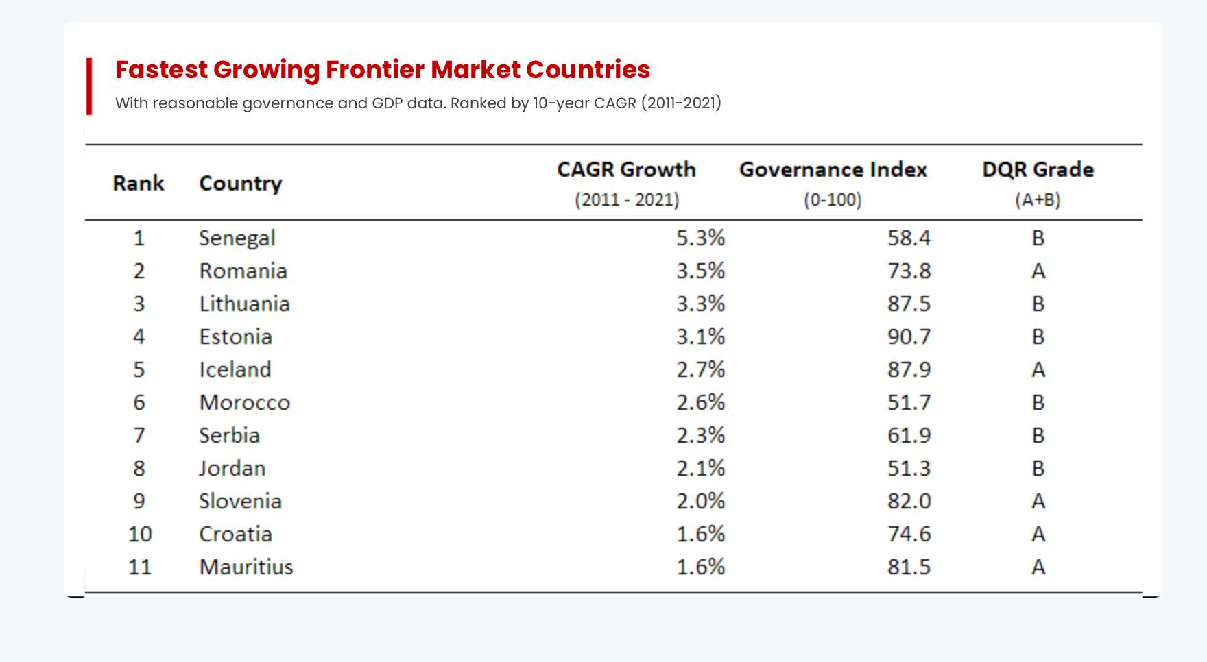 Néanmoins, le second pays africain sur la liste des 10 premiers pays à croissance moyenne régulière est le Maroc dont la moyenne a été de 2,6% de croissance pour la période, avec un taux de gouvernance encore moins bon que celui du Sénégal, car situé à 51,3/100. Le pays africain suivant, et qui est d’ailleurs le 11ème et dernier de la liste, est l’Ile Maurice, pays classé dans la catégorie A. Sa croissance moyenne n’a pourtant été que d’1,6% sur la période, même si en termes de gouvernance, le pays fait 81,5%, comme une bonne partie de pays occidentaux.