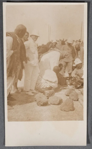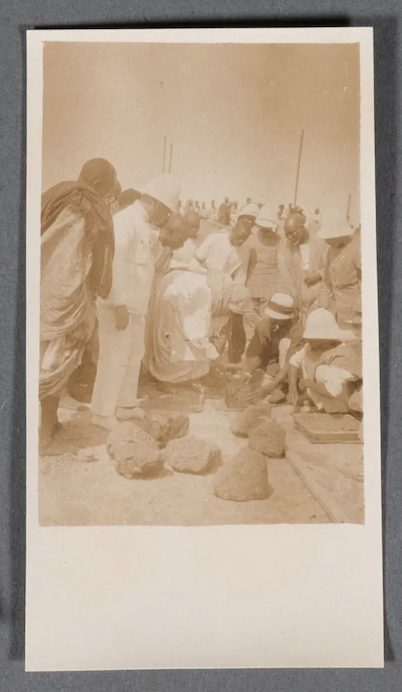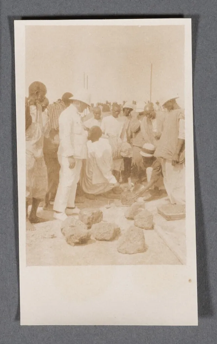 « Anonyme, de l’entourage de Jean Geoffre, architecte établi à Dakar Le Serigne Amadou Bamba, Cheikh Ahmadou Bamba (1853-1927) Exceptionnelle et rarissime suite de six (6) épreuves albuminées d’époque, montrant le Serigne Amadou Bamba, le 11 mars 1918, le jour de la pose de la première pierre de la mosquée de Diourbel, d’abord debout avec à ses coté Jean Geoffre, architecte de la première mosquée, puis posant la première pierre de la mosquée (3 épreuves), puis en marche et enfin en prière La première est légendée à l’encre dans la marge sous l’image :