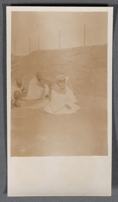 « Le Serigne Amadou Bamba » Épreuves : H. 7,2 cm – L. 4,1 cm ; H. 7 cm – L. 4,1 cm ; H. 7,6 cm – L. 4,1 cm ; H. 7,3 cm – L. 4,2 cm ; H. 6,9 cm – L. 4,2 cm et H. 7,6 cm – L. 4,1 cm Provenance : Album personnel de Jean Geoffre, Architecte à Dakar (Sénégal), auteur des plans de la mosquée de Diourbel ainsi que de ceux de la Grande Poste de Dakar Figure majeure de L’Islam au Sénégal, le Cheikh Ahmadou Bamba Mbacké ou Serigne Touba est le fondateur de la confrérie des Mourides, une voie unique du soufisme. Avant la découverte de cet ensemble, une seule et unique photographie du grand homme, père du Mouridisme était réputée connue. »