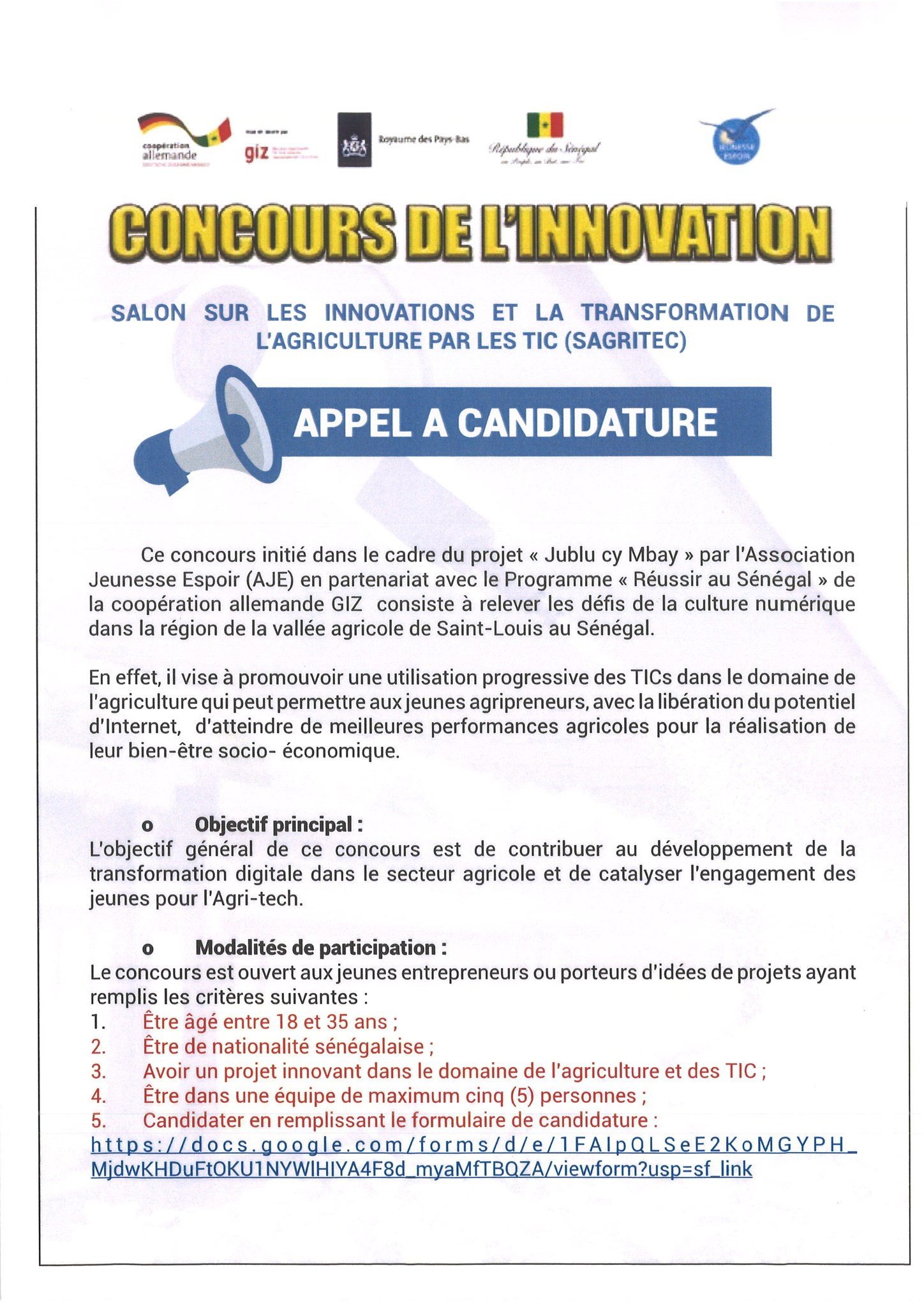 « Vous êtes jeunes et vous avez une projet innovant sur l’application des Technologies de l’Information et de la Communication à l’agriculture. Ce concours de l’innovation est alors pour vous. Il est organisé par AJE :Association Jeunesse et espoir dans le cadre du Programme Réussir au Sénégal de la #GIZ et cofinancé par les Pays-Bas.