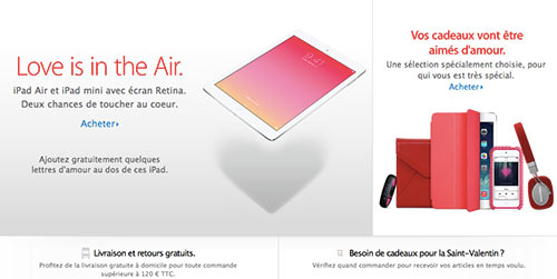 Envie d’un cadeaux pommés à offrir aujourd’hui? l’Apple store en ligne comme chaque année change d’habit pour se mettre au couleur de la saint-valentin soit un beau rouge pétant avec la mise en avant des produits phares et même…et même des sacs à mains (bizarre!) de la marque, de quoi croquer de la pomme en plein de dent.