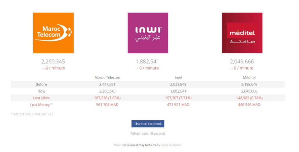 Nous pouvons ainsi voir à l’heure où nous écrivons ces lignes que Maroc Telecom avait 2 447 581 Likes et maintenant il se trouve avec 2 260 218 soit 187 363 likes de perdus en quelques heures. C’est phénoménal !!