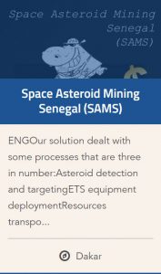 L’équipe gagnante a présenté l’application Space Astroid Mining Senegal pour la création d’un moteur spatial qui analysera les astéroïdes, le but étant d’aider à trouver de nouveaux minéraux qui peuvent être utilisés comme sources d’énergie pour une planète plus propre.