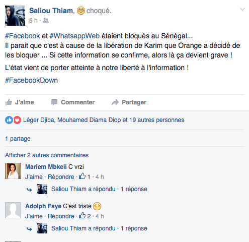 La rumeur circule actuellement sur les réseaux sociaux. D’après certains internautes, le réseau social Facebook a été bloqué entre 00h et 2h du matin durant la libération de Karim. Pour le moment l’information n’a pas été confirmée, mais selon certains blogueurs, » c’était plutôt un test de la part du gouvernement qui servira encore à d’autres occasions. »