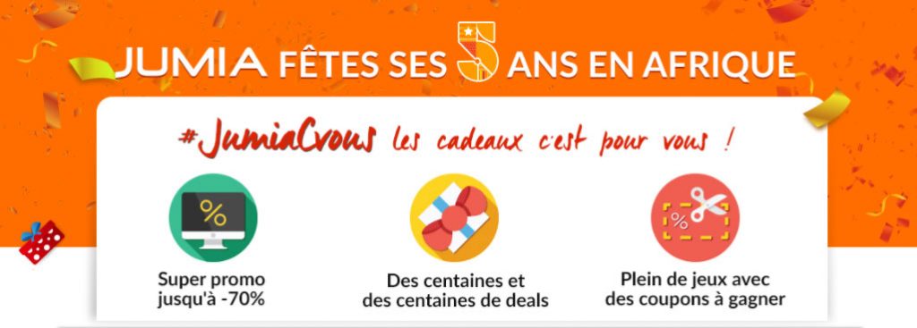 Jumia est le leader Africain du shopping en ligne. Depuis ses débuts, cette plateforme d’e-commerce n’a cessé de croître, grâce à un travail acharné, une abnégation indéniable, afin de rendre le shopping accessible à tous les Africains. Pour célébrer ensemble ce voyage de 5 ans, Jumia.sn a décidé de vous gâter avec les meilleures offres de toute l’histoire de Jumia, des superbes surprises, comme des réductions allant jusqu’à 70%, à partir du 26 juillet jusqu’au 2 août 2017.