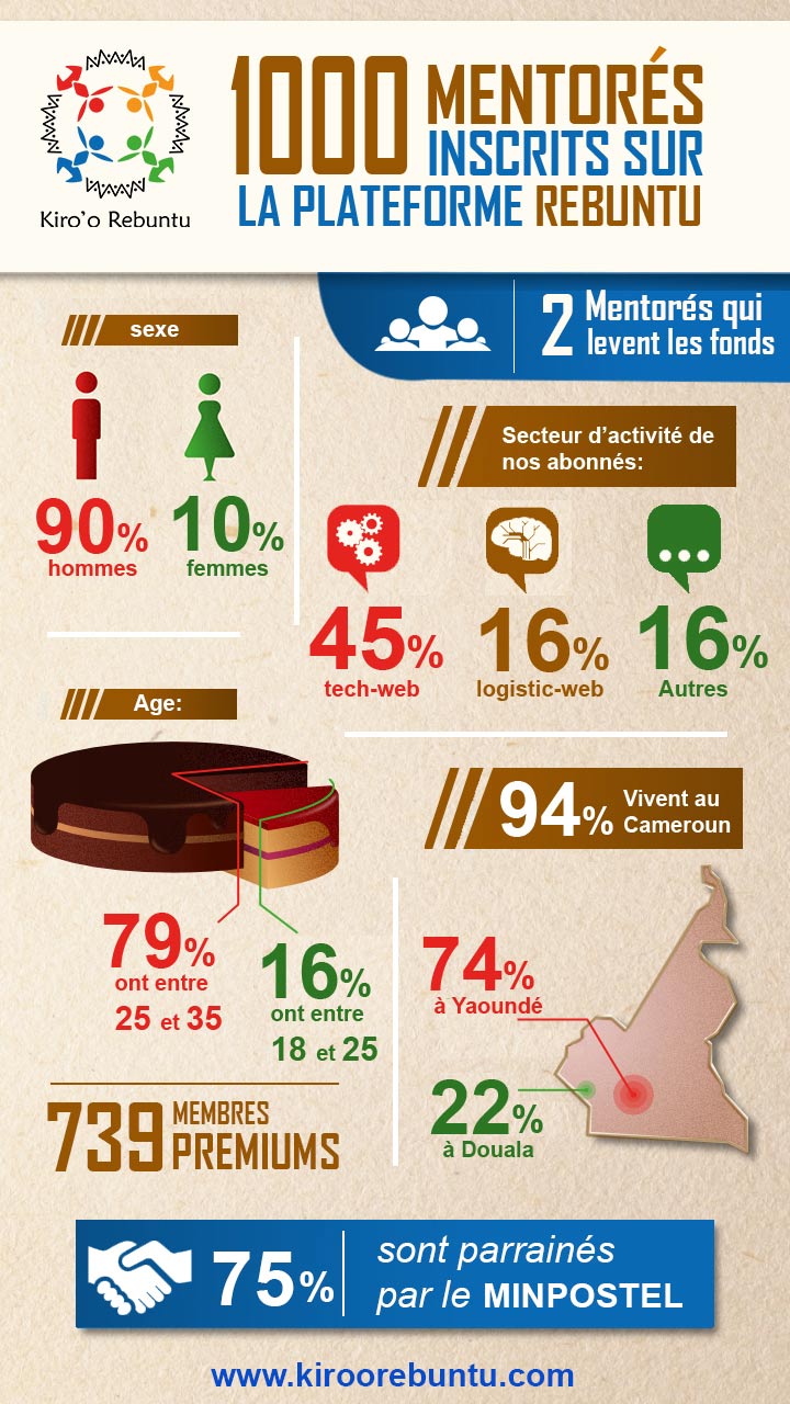 Kiro’o Rebuntu (disponible depuis le 6 juin 2017) est le service de partage d’expérience de la startup Kiro’o Games. 9 mois ont passé depuis son lancement et on décompte 1011 abonnés qui sont à 90 % des hommes âgés de 25 – 35 ans, qui résident pour la plupart dans les grandes villes du Cameroun telles que Yaoundé et Douala et qui ont en majorité des projets TIC. Le fait que le MINPOSTEL offre le mentoring dans le secteur des TIC justifie sans doute ses statistiques.