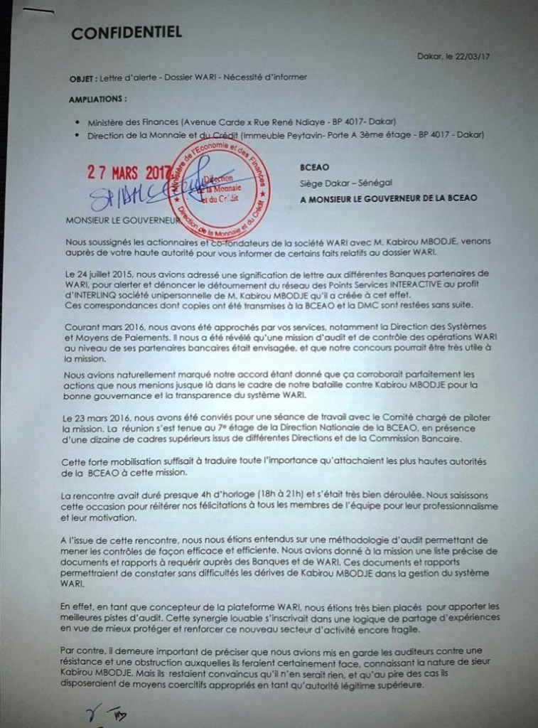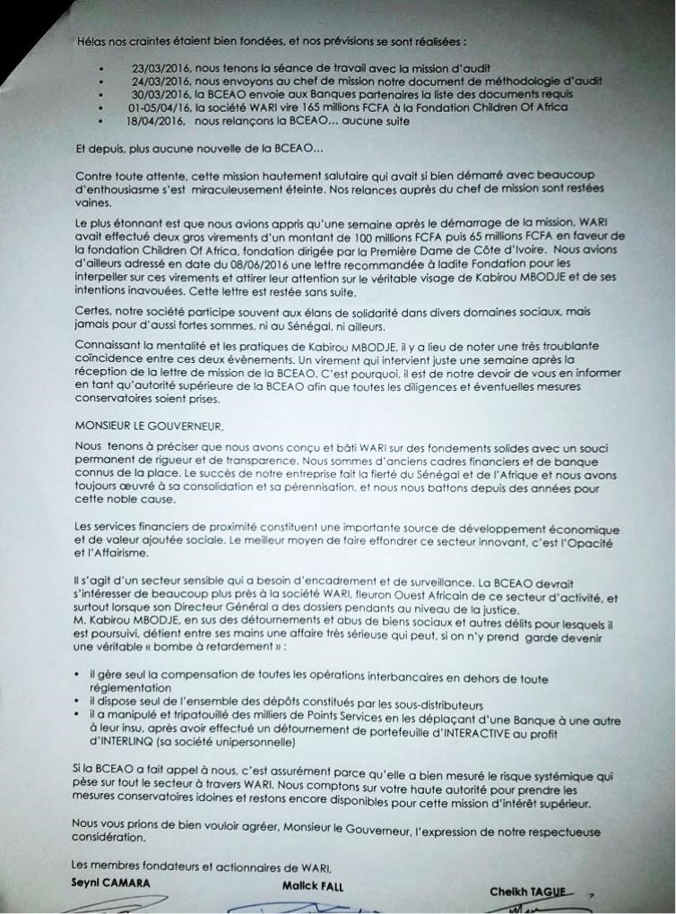 Seyni Camara, Malick Fall et Cheikh Tagué, qui se présentent comme co-fondateurs et actionnaires de Wari, ont adressé au gouverneur de la Banque centrale des Etats de l’Afrique de l’Ouest (Bceao), autorité de tutelle, et à Mme Dominique Ouattara, Première dame de Côte d’Ivoire, présidente de la Fondation Children Of Africa, qui aurait reçu un don de 300 millions de francs par virements signés de Kabirou Mbodje, directeur de Wari, ces courriers qui suivent.