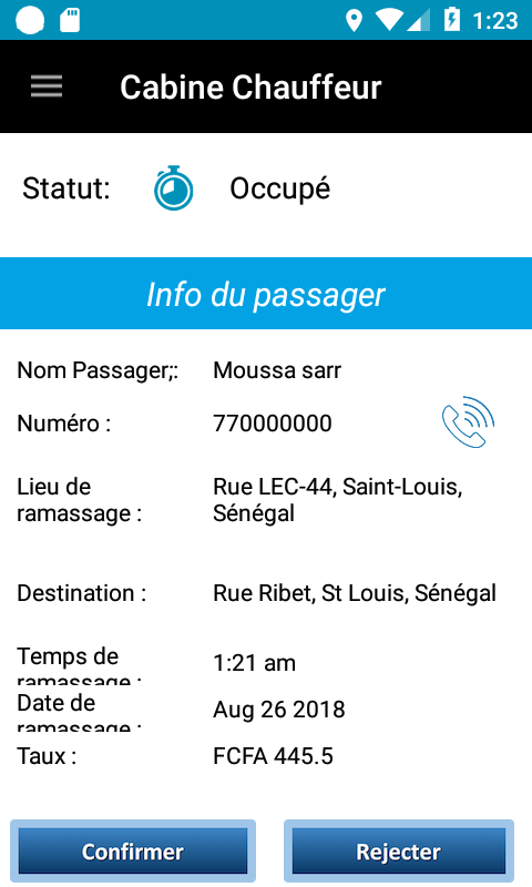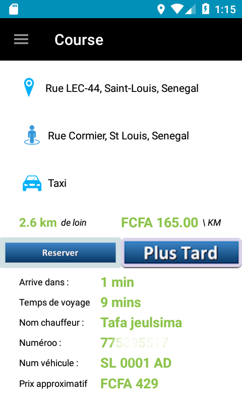 Ensuite, JEULSIMA vous envoie les informations du chauffeur disponible. Non seulement vous y verrez le numéro de plaque de son taxi, son nom et son numéro de téléphone mais vous pourrez également parvenir à suivre son avancée sur la carte et même le contacter en cas de besoin. Et pour finir, votre application vous permettra de voir les détails de votre course.