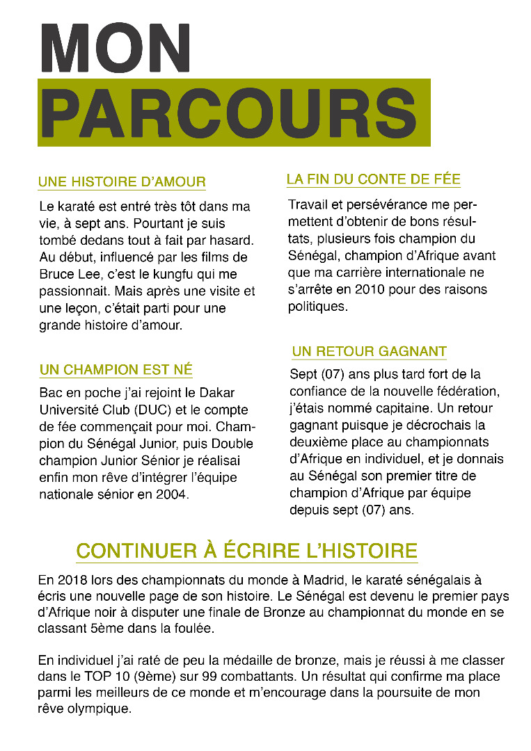 « Actuellement 11 ème sur le ranking olympique. Mon objectif majeur cette année, est de faire partie du TOP5. Pour se faire j’ai besoin de votre soutien pour supporter les coût (billets d’avion, Hôtels, restauration etc…) liés à la participation aux karaté league 1, mais aussi pour avoir une meilleure préparation (stages, suivi médical, nutrition, préparation physique). »