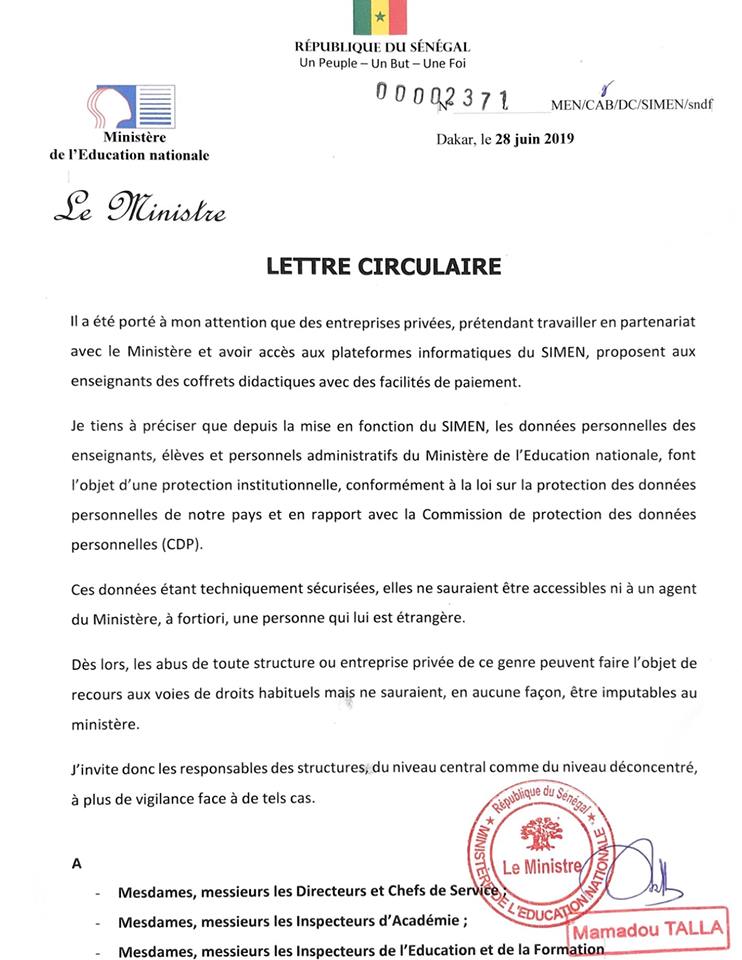 Par contre, pour cette fois- ci, l’actuel ministre, Mamadou TALLA, a rédigé une lettre circulaire pour se laver les mains de cette affaire. Il souligne que le MEN n’est pas responsable de cette « fuite » des données.