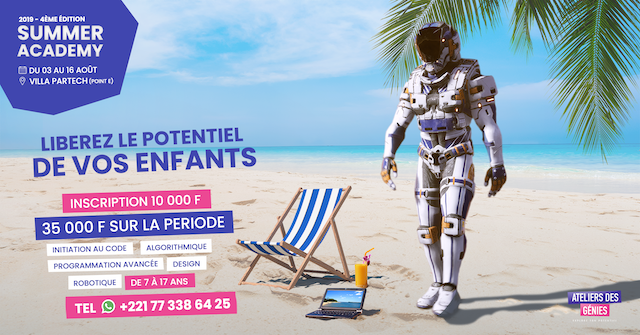 Atelier des Génies offre du 03 au 16 août prochain, dans un espace convivial à la villa Partech, la possibilité de faire de votre enfant un génie créateur en robotique, en Design et même en programmation avancée sans compter l’initiation au code et algorithme.