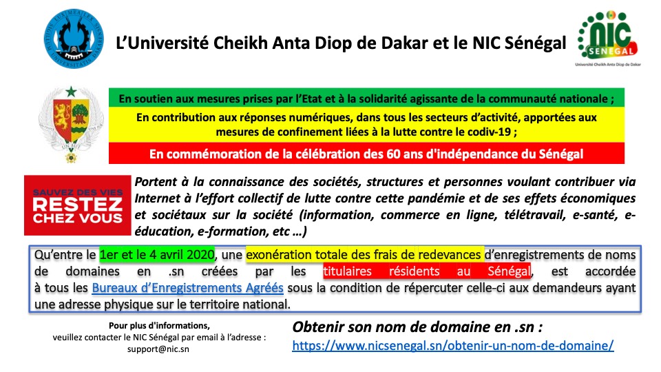 Le NIC Sénégal porte à la connaissance des sociétés, structures et personnes voulant contribuer via Internet à l’effort collectif de lutte contre cette pandémie et de ses effets économiques et sociétaux sur la société (information, commerce en ligne, télétravail, e-santé, e-éducation, e-formation, etc …) qu’entre le 1er et le 4 avril 2020, une exonération totale des frais de redevances d’enregistrements de noms de domaines en .sn créées par les titulaires résidents au Sénégal, est accordée à tous les Bureaux d’Enregistrements agréés.