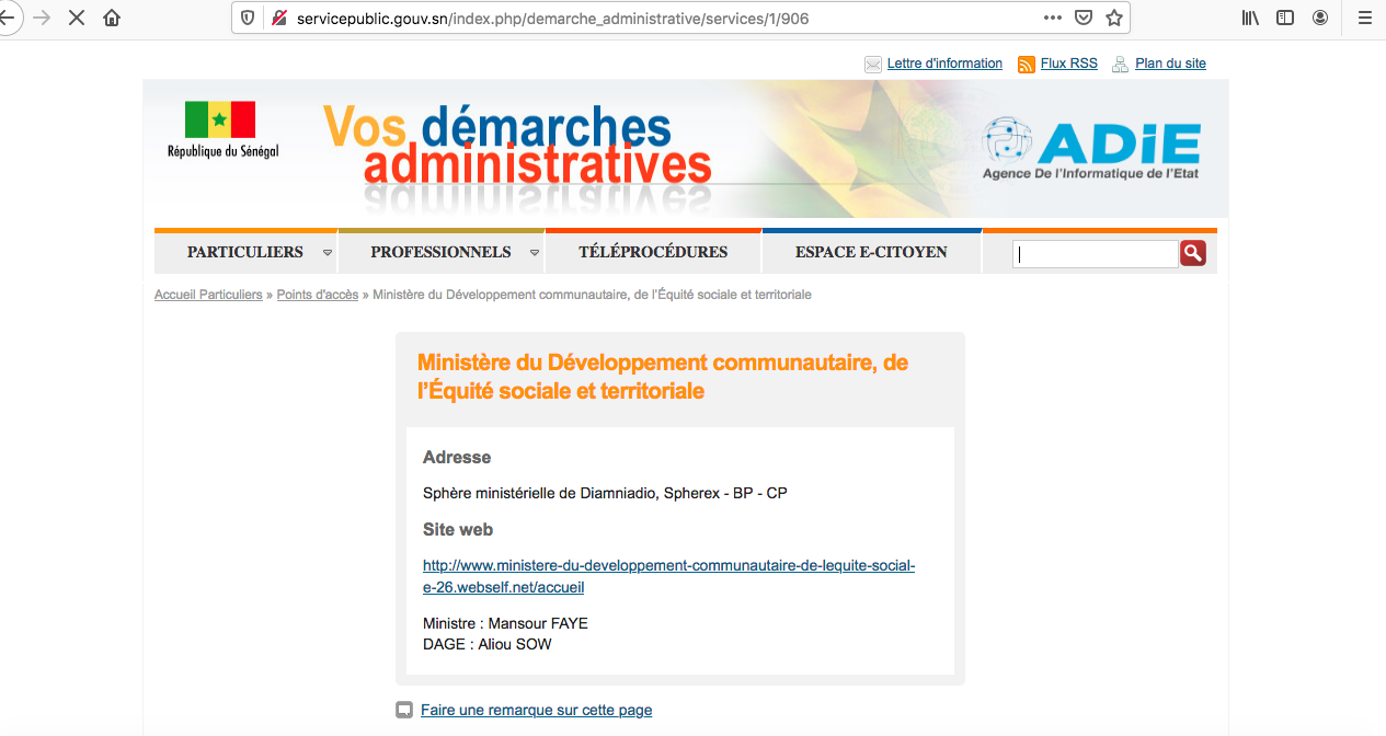 Plus grave encore, le site n’a pas encore de contenus mais il est déjà mis en ligne. En effet, ce n’est même pas un site web ce qu’on retrouve à travers ce lien https://ministere-du-developpement-communautaire-de-lequite-social-e-26.webself.net/services, nous n’avons pas de mots pour nommer ou décrire ce lien que l’ADIE a osé mettre sur http://www.servicepublic.gouv.sn/, site officiel du gouvernement.