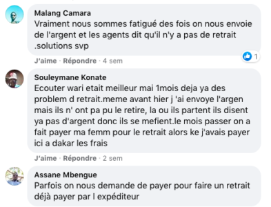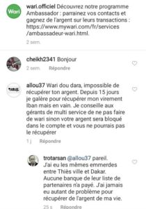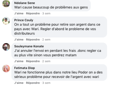 Beaucoup parmi eux fustigent le manque de sécurité dans le réseaux cause des arnaques qu’ils subissent. Ajoutant en cela, difficile d’avoir une réponse adéquate de Wari. Suite à une arnaque, Wari ne traque pas le voleur, donc aucun soutient voire accompagnement pour que la victime puisse poursuivre l’arnaqueur ni d’être remboursé par l’entreprise dont la faille provient de son système informatique.