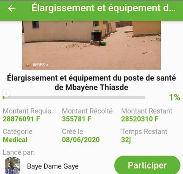 Fisha Sénégal, un influenceur avec plusieurs milliers de followers sur Instagram et Facebook porte ce challenge pour financer le poste de santé à partir de 100FCFA par follower. Pour participer, il suffit de se rendre sur l’application KATi360 et effectuer votre participation, quel que soit le montant.Voir cette publication sur InstagramJe viens de participer à la cagnotte. Wornaa ,lerr na.tout le monde peut savoir le montant de la cagnotte à chaque instant. Voici le lien d utilisation de l application sur youtube https://youtu.be/l8t7JLruU9Q Pour rappel ce challenge est pour Mbayene Thiasdé c’est un village polarisant une dizaine de villages dans la commune de Kamb. Les jeunes de ce village ont construit une annexe faisant office de poste de santé évitant les femmes de rallier Darah Djiolof (à 20km) pour accoucher en urgence. Pour les soutenir, une cagnotte est lancée sur l’application mobile de crowfunding KATI360. C’est pourquoi moi j’ai accepté de lancer ce challenge avec l’équipe de kati360 pour financer ce poste de santé en une semaine. C’est transparent et instantané en solde. Merci de participer et de partager ❤️ Une publication partagée par Snap: FishaSenegal (@fisha_senegal) le