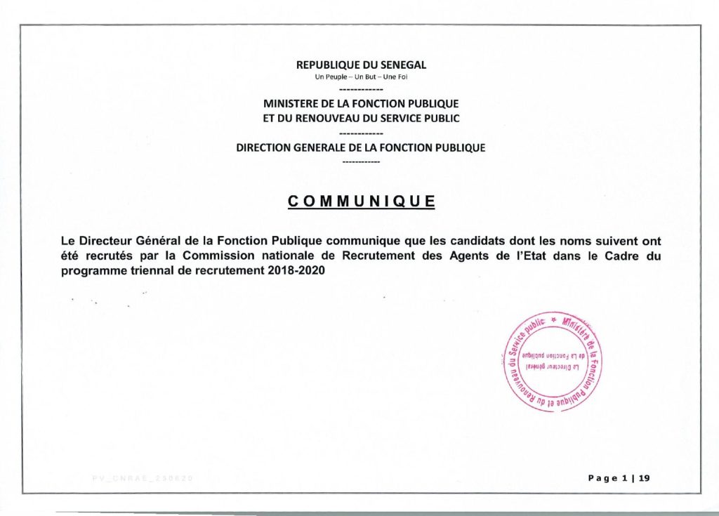 Le Directeur Général de la Fonction Publique communique que les candidats dont les noms suivent ont été recrutés par la Commission nationale de Recrutement des Agents de l’Etat dans le Cadre du programme triennal de recrutement 2018-2020.