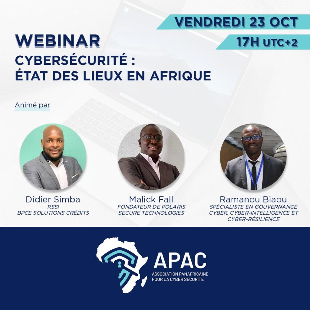 Pour en discuter l’Association panafricain pour la cyber sécurité organise un webinaire le Vendredi 23 Octobre 2020 à 17 H (UTC + 2) pour faire un état des lieux de la cyber sécurité en Afrique.