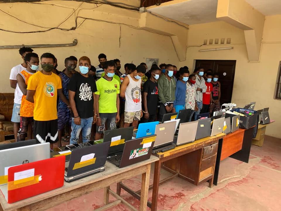 Sur sa page Facebook, la police togolaise affiche fièrement son dernier coup de filet. Une quarantaine de jeunes hommes, le visage caché derrière un masque, posent devant les armes du crime: des ordinateurs portables et des smartphones.