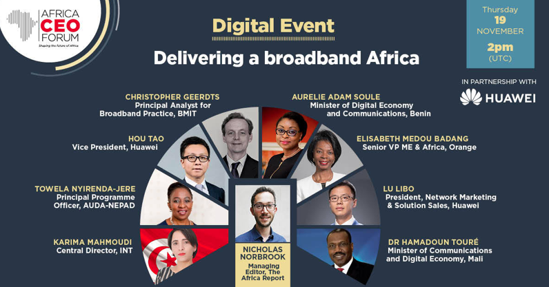 Le dernier webinaire de l’AFRICA CEO FORUM dédié aux chefs d’entreprise opérant en Afrique, en partenariat avec Huawei, avait pour thème « Delivering a broadband Africa », avec la participation de M. Hou Tao, Global Vice President de Huawei, et de M. Lu Libo, President Network Marketing & Solution Sales de Huawei.
