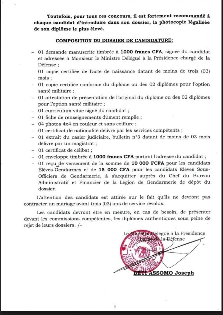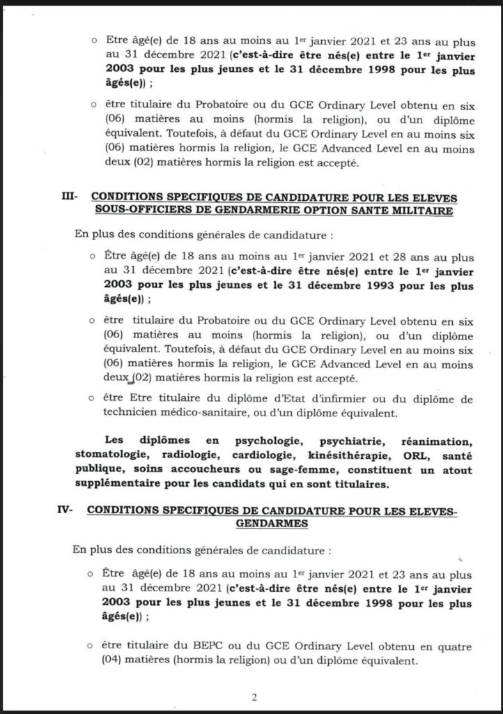 Le Ministère délégué à la Présidence chargé de la Défense communique :Il est porté à la connaissance des jeunes camerounais, qu’un concours pour le recrutement de 300 élèves Sous – Officiers de Gendarmerie option Service général, 40 élèves Sous – officiers de Gendarmerie option santé militaire, et 3000 élèves- Gendarmes, aura lieu à partir du 05 avril 2021 dans les chefs- lieux des 10 régions administratives du Cameroun.