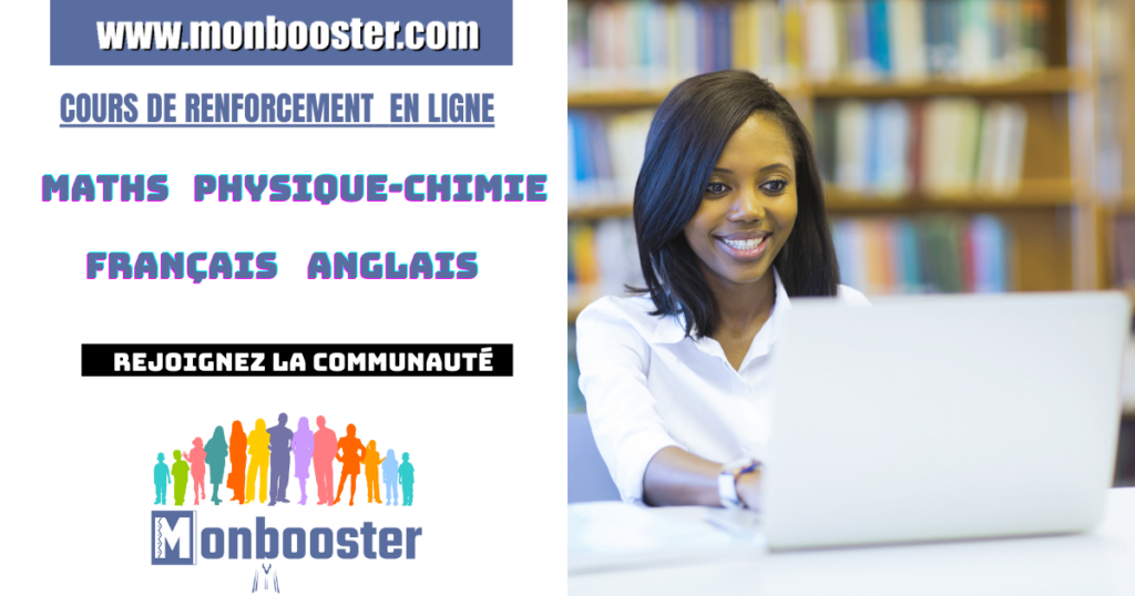 Monbosster est une plateforme de cours de renforcement entièrement en ligne disponible 24h/24 et 7J/7. Elle offre, sous forme d’abonnement, des programmes de révision en mathématiques, physique-chimie, français et anglais. Le choix a été fait sur ces matières car de manière générale (en plus de SVT), elles influencent particulièrement les orientations vers les séries littéraires ou scientifiques. A travers cet outil, nous voulons participer à l’augmentation des orientations vers les séries scientifiques.
