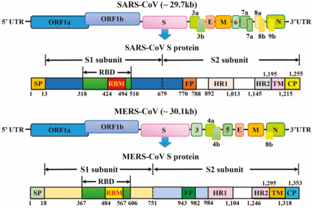 La protéine S est composée de deux sous-unités. La première contient le domaine de liaison (RND) pour ACE2 ; la seconde contient le domaine FP, situé près du second site de clivage. Ce domaine permet la fusion et l’entrée du virion, avec les autres domaines, les heptades, HR1, HR2, le domaine transmembranaire, TM et l’endo-domaine, E. Cette partie composite assure la translocation du virion dont le génome traverse le cytoplasme en direction de l’appareil ribosomal.