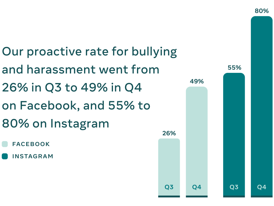 - 5 millions d’éléments de contenu d’intimidation et de harcèlement, contre 2,6 millions au 3e trimestre, en partie grâce à la mise à jour de notre technologie de détection des commentaires