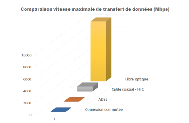 La technologie la plus récente utilisée pour transférer des données numériques est la fibre optique qui présente beaucoup plus d’avantages que les moyens de transport d’information cités précédemment. Son premier avantage est qu’elle offre la possibilité d’atteindre des vitesses maximales de transfert de données jamais égalées jusque-là car l’information est transportée via la lumière.