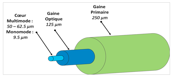 Pour comparaison, la taille d’un cheveu est comprise entre 50 et 100 µm. Le cœur de la fibre possède un diamètre ajustable d’environ 9.5 µm pour les fibres monomodes (meilleur débit et faible atténuation) qui sont plus efficaces sur les longues distances et donc pour les grandes installations car elle ne laisse passer qu’une seule mode de lumière. Le diamètre du cœur est cependant plus grand (50 ou 62.5 µm) pour les fibres multimodes qui sont plus efficaces sur les courtes distances et donc sur des installations locales à cause de sa capacité à laisser passer plusieurs modes de lumière et donc différents types de données sur une même fibre.
