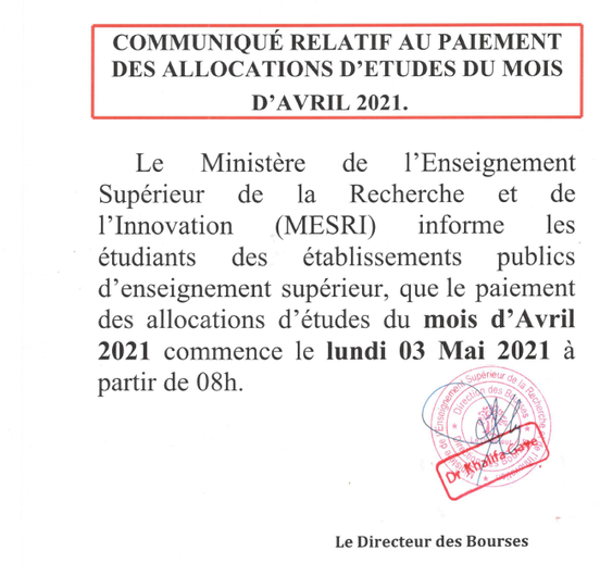 Le paiement des allocations d’études du mois d’avril 2021 commence à partir du lundi 3 mai 2021 selon le communiqué du Ministère de l’Enseignement supérieur, de la Recherche et de l’Innovation.