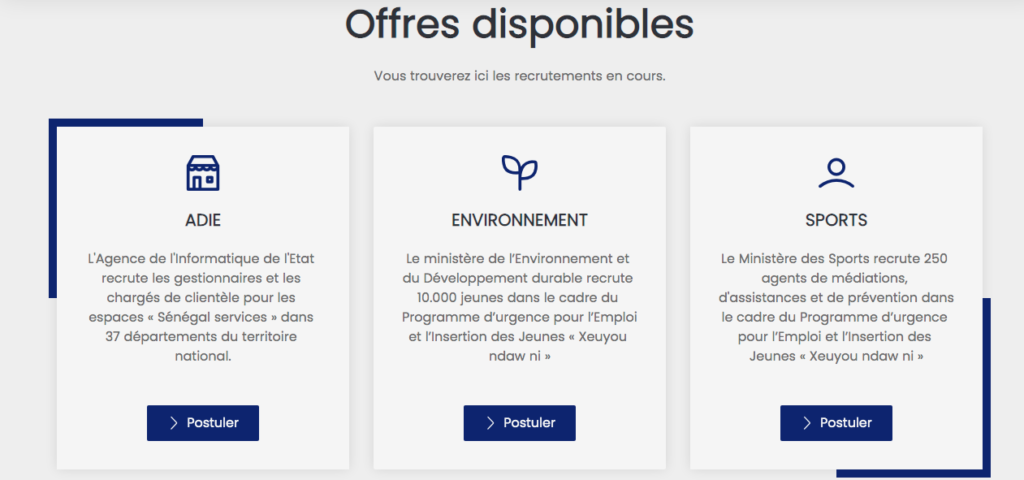 Pour vous inscrire au programme de recrutement de 65000 jeunes dans tout le Sénégal, vous pouvez cliquer sur le poste qui vous intéresse et suivre les étapes ci-dessous :