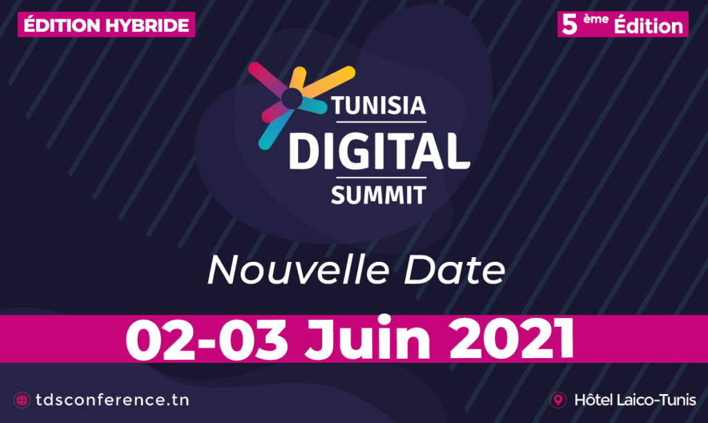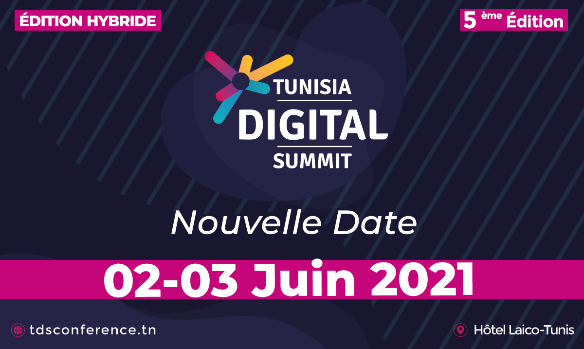 La 5ème édition de Tunisia Digital Summit se déroulera les 02 et 03 juin 2021 sous un format hybride : à la fois en présentiel à l’hôtel Laico Tunis et en virtuel via « TDS Online Event Platform » by Eventoo.