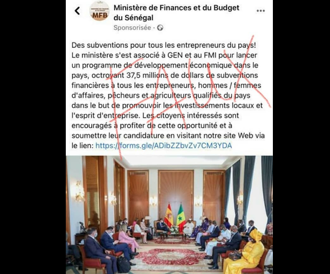 Attention, certainement, vi vous êtes sénégalais, vous avez vu un de vos contacts mettre en statut un message annonçant des subventions pour tous les entrepreneurs du pays. Sachez que c’est de l’arnaque. Le Ministère des Finances et du Budget vient de dénoncer ce faux message publié à travers un faux compte.