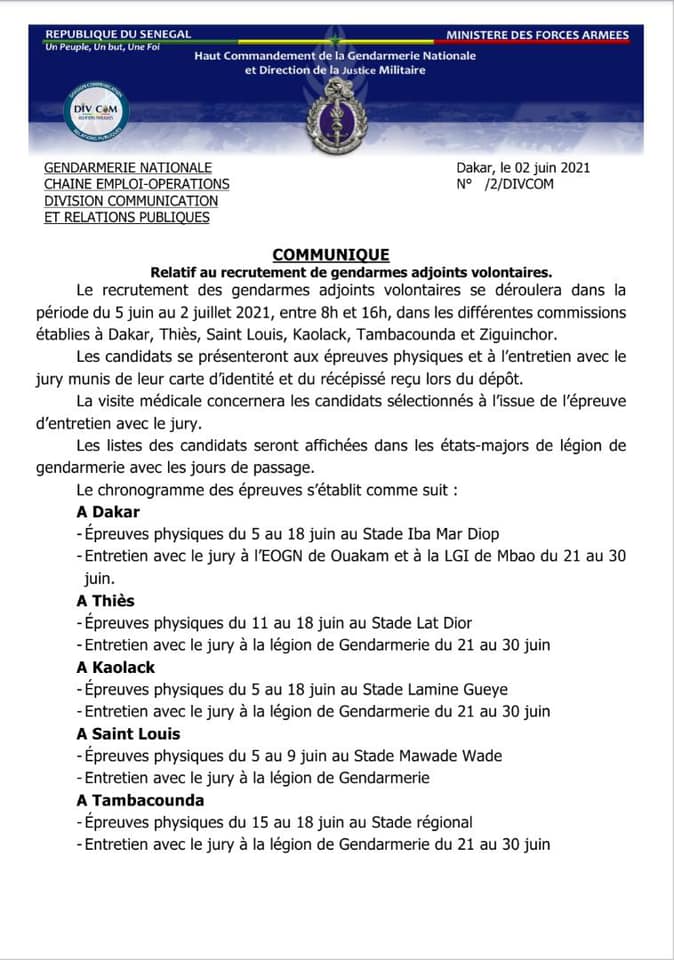 Le recrutement des gendarmes adjoints volontaires se déroulera dans la période du 5 juin au 2 juillet 2021, entre 8h et 16h, dans les différentes commissions, informe le Haut commandement de la Gendarmerie nationale.