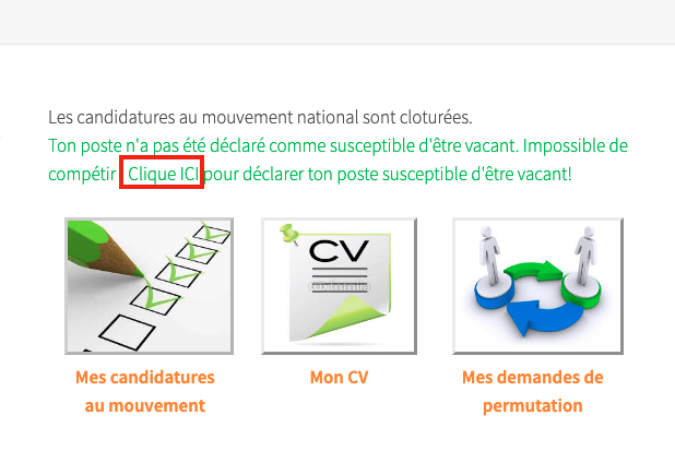Ton poste n’a pas été déclaré comme susceptible d’être vacant. Impossible de compétir ! Clique ICI pour déclarer ton poste susceptible d’être vacant!