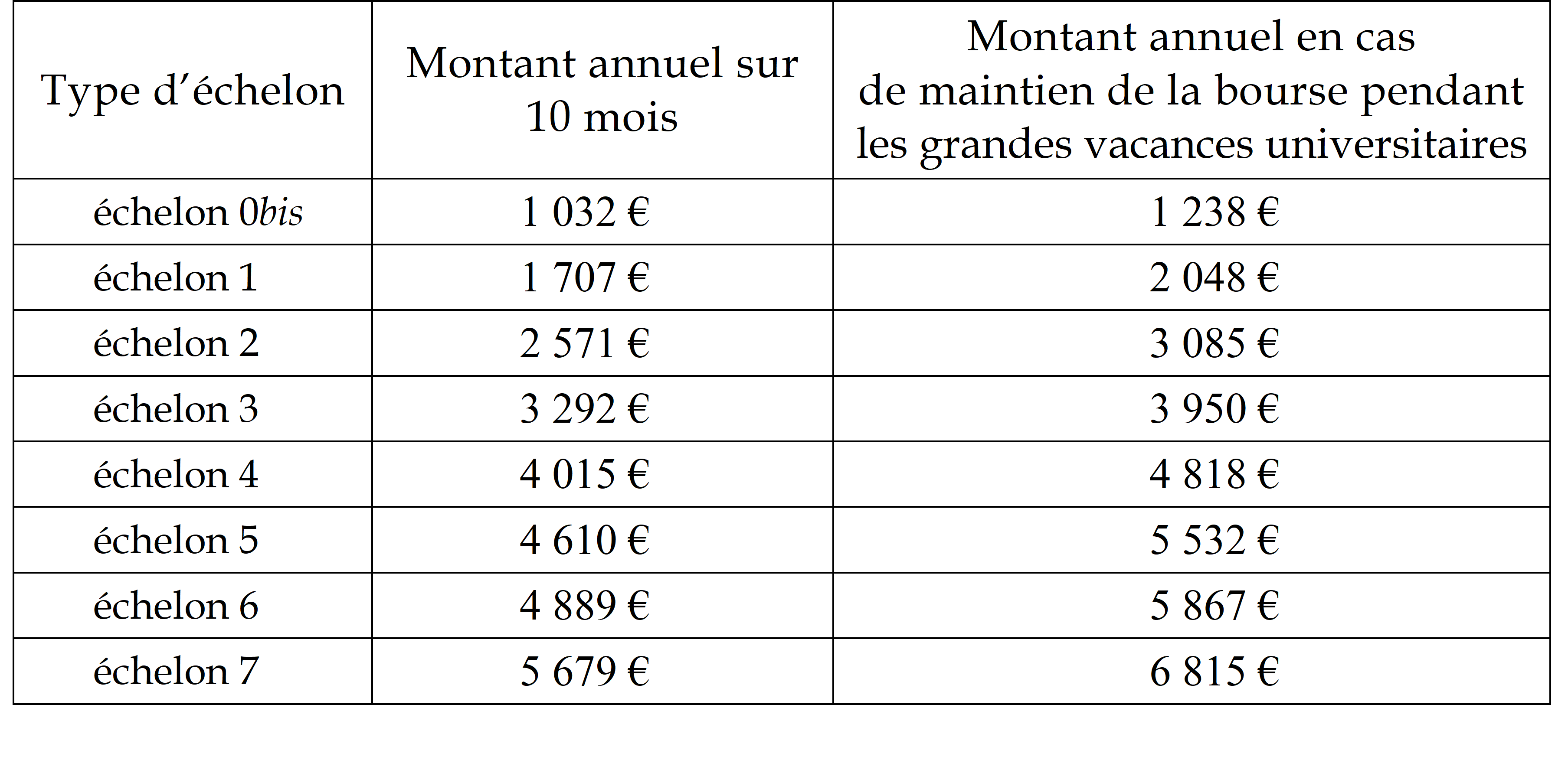 Pour les étudiants de premier cycle, lorsque l’étudiant passe de la L1 à la L2, s’il a une mention (à partir de la moyenne de 12/20), il a une bourse entière. Si l’étudiant est admis en classe supérieure sans mention, il reçoit une demi-bourse.