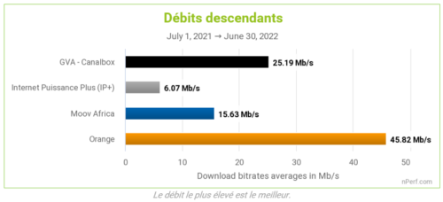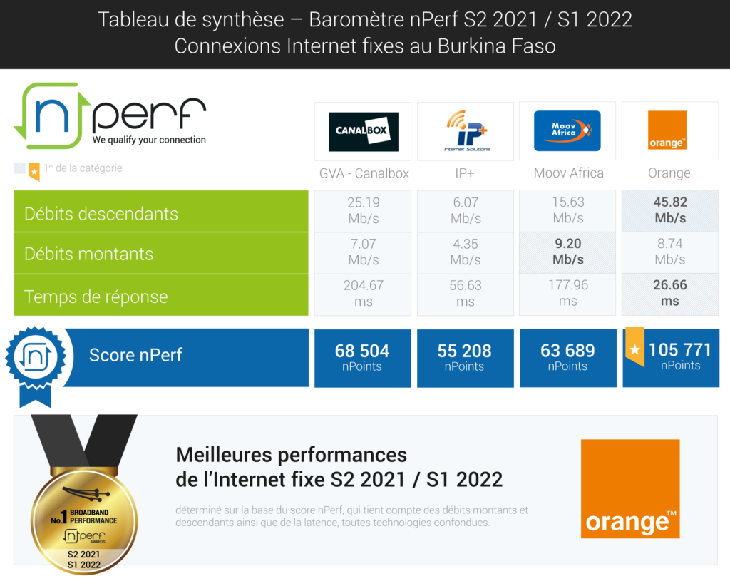 A l’occasion du premier baromètre sur les connexions fixes à Internet au Burkina Faso, il en ressort qu’Orange s’impose aisément à ses concurrents, ce qui est d’autant plus significatif qu’Orange représente plus de 36% des tests retenus. En effet, sur les trois principaux indicateurs étudiés, Orange remporte sans difficulté la course au débit descendant et celle de la latence, avec des niveaux moyens de 46 Mb/s et 27 ms respectivement. Ces résultats sont deux fois plus performants que ceux de ses plus proches compétiteurs : CanalBox (marque du groupe français Vivendi) pour le débit descendant, et Internet Puissance Plus pour la latence.