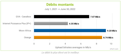 Quant au débit ascendant, Moov Africa (filiale de Maroc Telecom) tire son épingle du jeu, en enregistrant une vitesse moyenne sensiblement supérieure à celle d’Orange, à 9,20 Mb/s. Ce dernier affiche 8,74 Mb/s, échouant de justesse à obtenir une victoire partagée sur cet indicateur, et par conséquent le grand chelem.