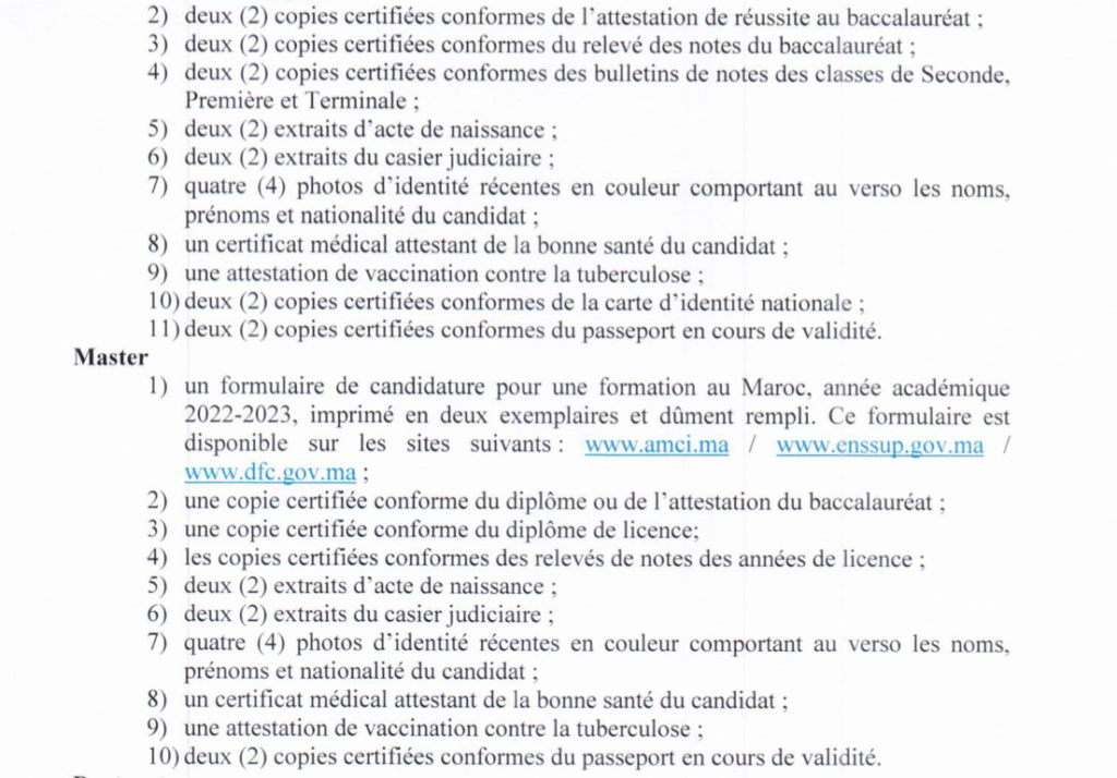 Un formulaire de candidature pour une formation au Maroc, imprimé en deux exemplaires et dument rempli. Ce formulaire est disponible sur les sites suivant : www.amci.ma ; www.ensup.gov.ma ; www.dfc.gov.ma
