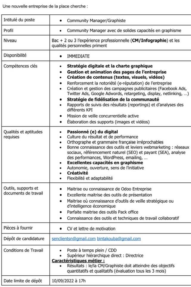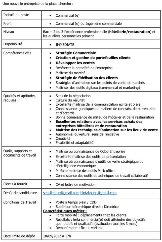 CV et lettre de motivation à envoyer sur senclientsn@gmail.com ou bintakouba@gmail.com, au plus tard, le 10/09/ 2022 à 17h.