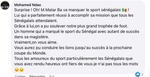 Cette décision de Macky Sall, on n’arrive toujours pas à la comprendre. Comment peut on faire partir Matar BA en si bon chemin alors qu’il a effectué un parcours plus que honorable !!! Vouloir faire plaisir à des partisans au détriment de notre très chère patrie, quelle honte