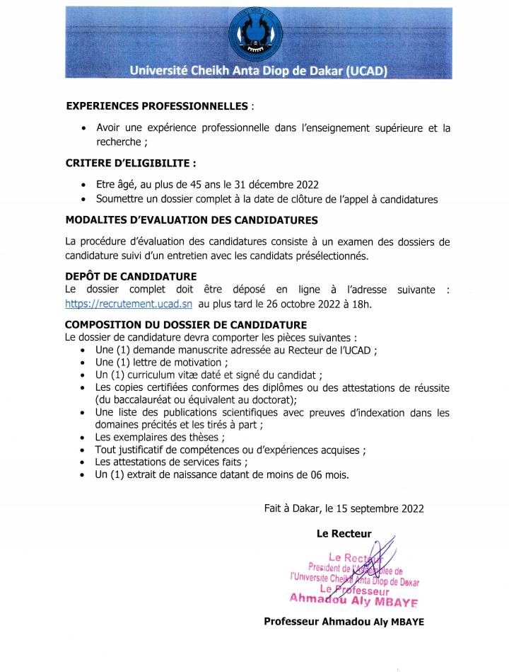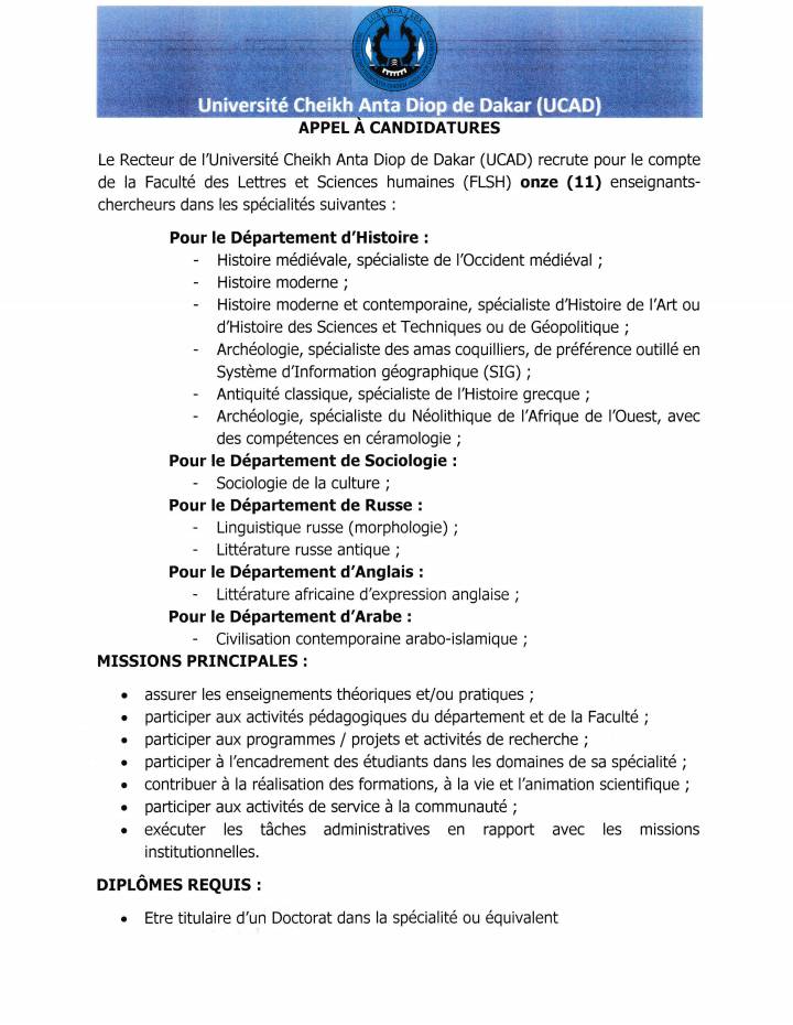 Le Recteur de l’Université Cheikh Anta Diop de Dakar (UCAD) recrute pour le compte de la Faculté des Lettres et Sciences humaines (FLSH) 11 enseignants- chercheurs pour les départements suivants: Histoire, Sociologie, Russe, Anglais et Arabe.